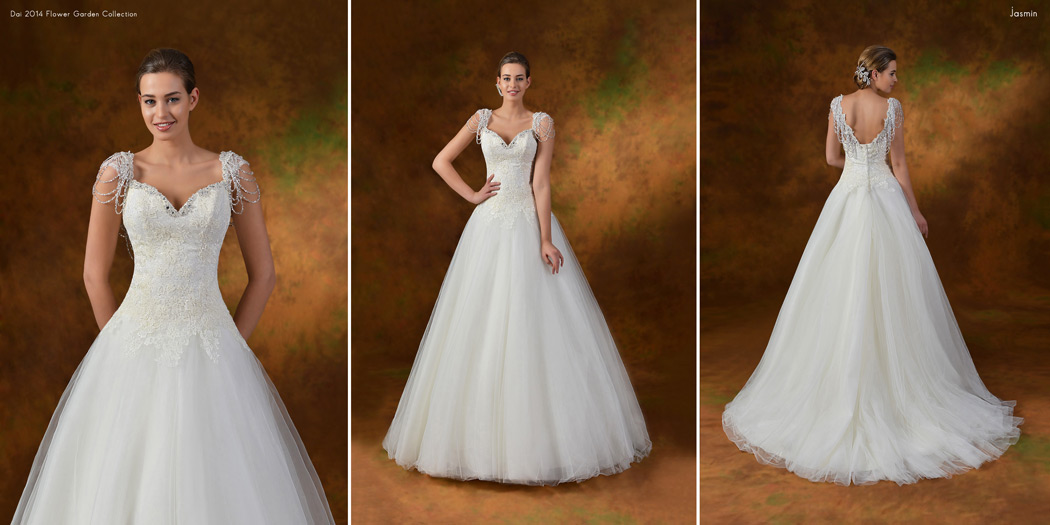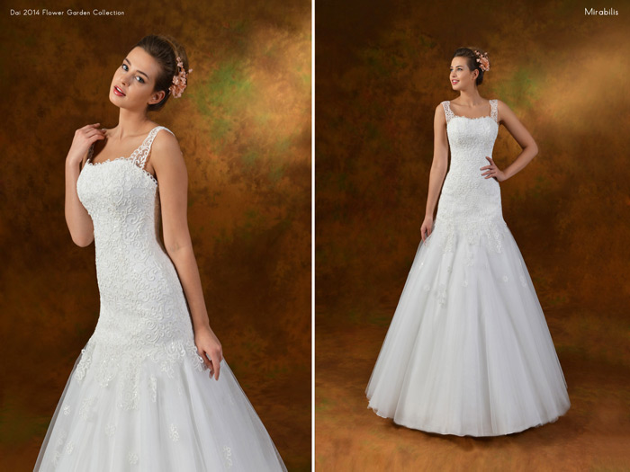 Dai gelinliğin 2014 gelinlik modelleri içerisinde yer alan bir model. Basenlere kadar inen dantel detaylı ve kolda kalın askıların yer aldığı bir gelinlik modeli. Bu yılın en çok tercih edilen gelinlik modelleri içerisinde yer aldı bu tarz gelinlikler. Prenses gelinlik dediğimiz belden aşağı birden kabaran gelinlik modelleri yerine genç hanımlar bu tip daha naif formlarda gelinlik modelleri tercih ettiler 2014 gelinlik modelleri içerisinden.
