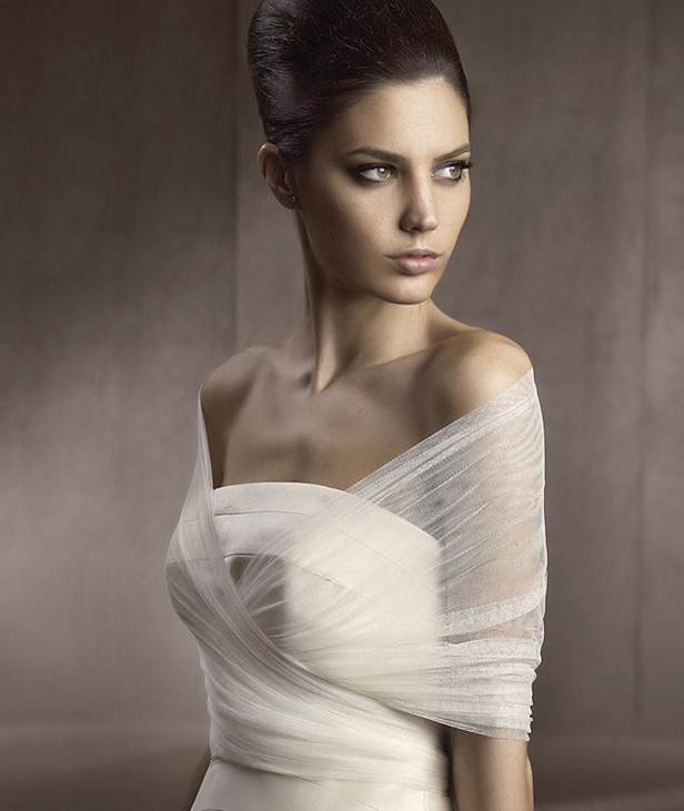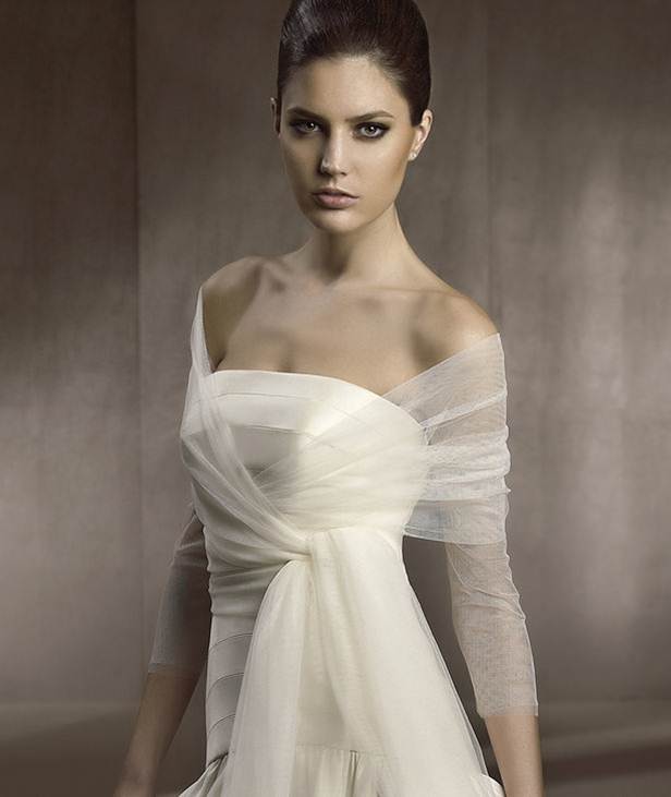 Nasıl da zarif görünüyor değil mi? Straplez bir gelinliğe sade tül bir şal eşlik ediyor, çapraz bağlanarak tasarlanmış olan bu model tıpkı tek parça bir gelinlik görünümünde. Sizlerde ufak dokunuşlarla gelinliğinizi değiştirmek isterseniz eğer gelinlik bolerosu ve gelinlik şalı modelleri galerimizde sizleri bekliyor.
